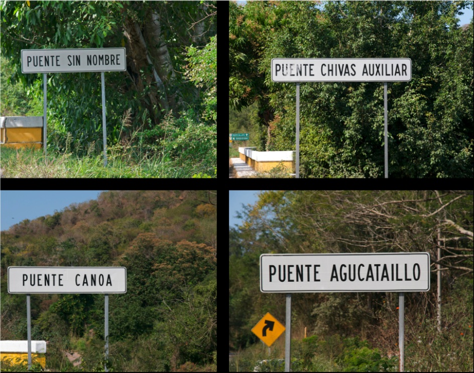 Jede von Mexico's Brücken erhält einen Namen, entweder überbrückt sie einen veritablen Fluss oder Arroyo in einer Stadt oder auch nur ein kleines Bächlein in einem Feld. Einen Namen hat jede von ihnen- mindestens den Zusatz z.B. Puente Canoa Auxiliar II, was eigentlich die zweite Hilfsbrücke über den Canoa bedeutet. Meistens ist die Brücke nach einer Ortschaft oder einem Weiler benannt, oder dann nach dem Gewässer, welches sie überbrückt.
