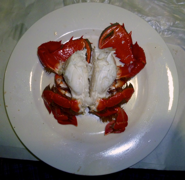 Wir kauften das ganze Monster schon gekocht und vom äusseren Panzer befreit. Noch in diesem Zustand wartete viel Arbeit auf uns, und dies erst noch ohne das notwendige Werkzeug. Ein Nussknacker sowie eine Hummer-Gabel hätten Wunder vollbracht. So musste ich mich mit der Krabbenzange behelfen. Damit konnte ich das meiste Fleisch aus den Beinen herauskratzen. Brigitte gab auf, sie begnügte sich mit dem leicht zugänglichen Fleisch.