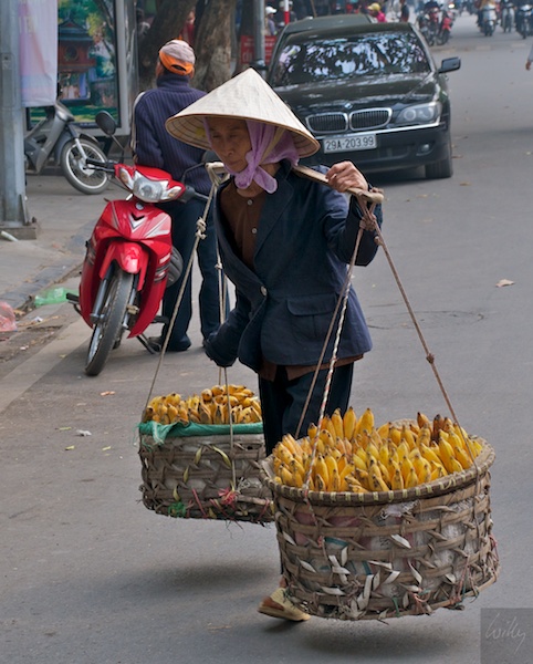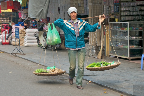 Viele Frauen tragen Früchte, Gemüse und auch ganze Garküchen mit den Tragestangen durch die Stadt. Gut ausbalanciert werden die Lasten tragbarer, bleiben aber sicher immer noch sehr schwer.