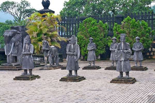 Die Mandarine beim Khai Dinh Tomb stehen immer noch stramm Wache, der zu Stein erstarrte Reitelefant kommt auch nicht recht vom Fleck. Diese Anlage ist noch jung, sie wurde erst im 20. Jhdt. erbaut, französische Architekten bauten massgeblich daran mit, der Kaiser war auch nicht viel mehr als ihre Marionette. Viel Kitsch im Innern kontrastiert stark mit der fantastischen Umgebung.