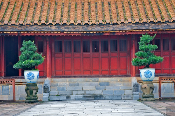 Ein weiteres Gebäude im Minh Mang Tomb ist nun beinahe perfekt symmetrisch. Sogar die Topfpflanzen sind sehr ähnlich, auch wenn sich nicht alle Äste an die Regeln halten.