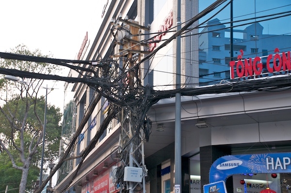 Ich hoffe, dass keiner meiner Leser Elektriker ist, sonst lehne ich schon mal jede Verantwortung für allfällige Gesundheitsschäden nach dem Betrachten dieser Installation ab. Kein Einzelfall, sondern in Saigon an jeder Hausecke so zu sehen.