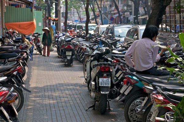 Viele Trottoirs sehen aus wie auf diesem Bild: Vollgestellt mit Rollern, ein Durchkommen als Fussgänger ist teilweise fast unmöglich. Immerhin machen die abgestellten Dinger keinen Lärm und Gestank. Glücklicherweise sind die Roller Viertakt-Motoren, sie verbrennen kein Öl und stinken nicht so penetrant wie die Zweitakter.