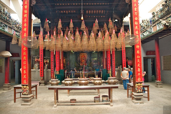 Auch in diesem chinesischen Tempel werden Räucherstäbchen in grossen Schalen entzündet. Als Besonderheit kaufen die Chinesen Räucherspiralen und hängen diese an der Decke auf. Mit einem Zettel markieren sie ihre Wünsche, welche mit dem Rauch gegen Himmel getragen werden.