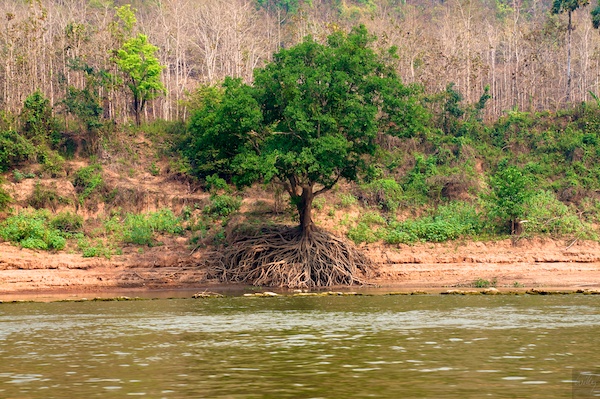 Der Mekong führt zur Regenzeit sehr viel mehr Wasser als jetzt, der Pegelstand liegt dann mindestens zwei Meter höher. Dieser Baum wurde während seines Lebens schon oft ausgespült, was ihn aber offensichtlich nicht schädigt. Das Wurzelwerk liegt weitgehend offen.