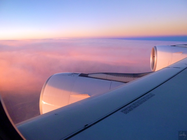 Um kurz nach 6 Uhr ging für uns die Sonne über Australien auf. Für uns war dieser Moment kurz nach der Grenze zwischen den Northern Territories und Queensland etwas weniger als zwei Sunden vor der Landung in Sydney. Leider sassen wir auf der falschen Seite des Flieger, da die Sonne natürlich auch auf der Südhalbkugel im Osten aufgeht. Aber so wichtig war dieses Naturschauspiel dann doch nicht. Immerhin ist die aufgehende Sonne auf dem näheren Triebwerk gut sichtbar und auch die Wolken leuchten richtig kitschig.