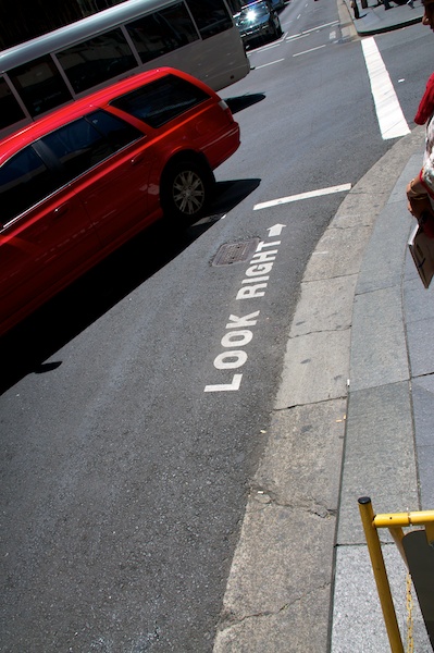 Der Linksverkehr Australiens ist offensichtlich schon einigen Touristen zum Verhängnis geworden, deshalb weisen nun Markierungen vor allen Fussgänger-Streifen darauf hin, dass der gefährliche Verkehr von rechts kommt. Unser „Links gehen, Gefahr sehen“ ist hier schnell einmal fatal, da der Bus dann von hinten kommt. Die Australier waren sich der Kosten der Ausbeul-Arbeiten ihrer Autos wohl leidig, deshalb investieren sie lieber in die Beschriftung der Fussgänger-Streifen. Sowohl Fussgänger, als auch Automobilist haben so für einmal einen Nutzen.