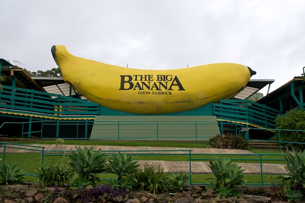 Das Wahrzeichen von Coffs Harbour ist die Big Banana, ein Hinweis darauf, dass in dieser Gegend viele Bananen angebaut werden. Die ganze Gegend lebt vom Nimbus dieser Früchte und immer wieder werden wir gefragt, ob wir diese gigantische Sehenswürdigkeit auch tatsächlich sahen. Selbstverständlich bejahen wir diese Frage jedes mal, es stimmt ja auch. Würden wir allerdings nach unserem Eindruck gefragt, antworteten wir sicher nicht mit „Wow, what a treat“ oder „Great!“, da wir von der ganzen Anlage sehr enttäuscht sind. Gross ist die Banane, das zumindest stimmt.