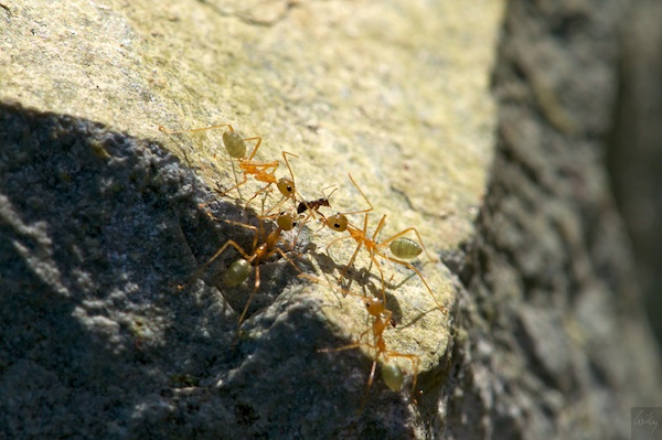 Ein wahrer Krieg tobte zwischen zwei Ameisenarten: Ein kleine schwarze fiel zwischen ein paar grössere und wurde gnadenlos hingemacht. Auch in der Natur gilt das Motto, dass keine Gefangenen gemacht werden! Die einzelnen Gliedmassen der kleinen Ameise wurden von den grösseren ausgerissen und gefressen. Es bleibt auch nichts liegen, alles wird rezykliert.