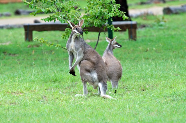 Unser Campground lag mitten in einem Nationalpark, dem Undara Volcanic National Park. Wir wollen uns am nächsten Tag die riesigen Lava-Tubes ansehen, welche ein Vulkanausbruch vor „nur“ 190‘000 Jahren kreierte. Der Campground ist nicht eingehagt, weshalb die Wildtiere hier frei zirkulieren können. Diese beiden „Pretty-faced Wallabies“ haben absolut keine Scheu vor den Menschen, sie lassen den neugierigen Besucher bis auf knapp einen Meter an sich heran, bevor sie dann doch die Flucht ergreifen.