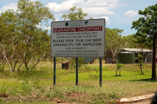 Die Einfuhr nahezu sämtlicher Landwirtschafts-Erzeugnisse nach West-Australien ist verboten, sogar Honig darf nicht über die Grenze gebracht werden. Früchte und Gemüse müssten entsorgt werden, falls noch Vorräte vorhanden sind. Der Grund für diese Strenge liegt in der riesigen Agro-Industrie im Westen, sämtliche Schädlinge sollen auf der anderen Seite der Grenze bleiben. Wir hatten natürlich pflichtgemäss keine Produkte mehr dabei, die eine Birne assen wir noch vor dem Grenzübertritt als leichten Lunch.