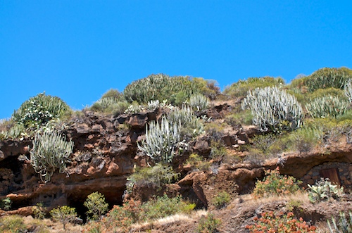 Der Nordwesten von La Palma ist eine bizarre Landschaft, eine Steilküste mit immer wieder schönen Ausblicken auf den Atlantik und einer spannenden Vegetation. Grosse Pinienwälder stehen ab etwa 500 m.ü.M., darunter sind die Hänge und Brachflächen mit Kakteen (Opuntia) und vielen Euphorbien überwachsen. An den offenen Lavafelsen sind Aeonium in allen Formen stark verbreitet.