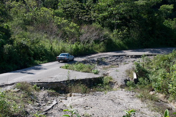 Die Hauptroute, welche von Touristen und auch vom Schwerverkehr befahren wird, führt weiter westlich unserer Route. Wir wählten die landschaftlich interessante Strecke, nachdem wir uns bei lokalen Taxifahrern über den Streckenzustand informierten. Mit Ausnahme zweier Stellen war die Strasse absolut problemlos. Hier zB. ist die Strasse zu 3/4 weggebrochen, mit entsprechender Vorsicht lässt sich aber sicher befahren. In einer Ortschaft war die Strasse relativ steil und auf etwa 30 m von jedem Belag befreit. Ein erster Versuch, die Stelle zu durchfahren war erfolglos, ich musste zurückrollen lassen. Ich war anscheinend zu zaghaft so dass die Schalt-Automatik nicht mit der Steigung und den durchdrehenden Räder umgehen konnte. Also holte ich genügend Anlauf und fuhr mit Getöse auf die Stelle zu; mit gehörigem Gerumpel schafften wir den Engpass im zweiten Anlauf unter intensiver Beobachtung einiger Einheimischer.