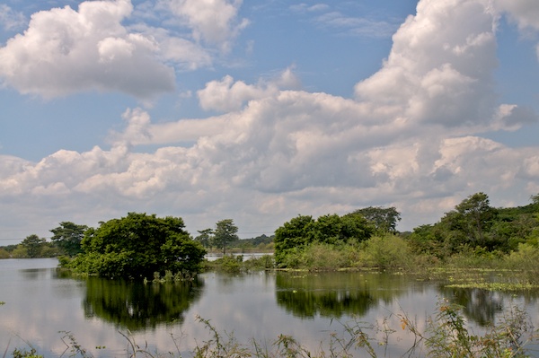 Felder für die Viehzucht stehen unter Wasser, welches nur langsam abfliesst und verdunstet. Auch die Bäume stehen im Wasser, falls es in absehbarer Zeit abläuft, erholen sie sich wieder.
