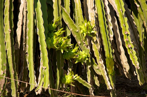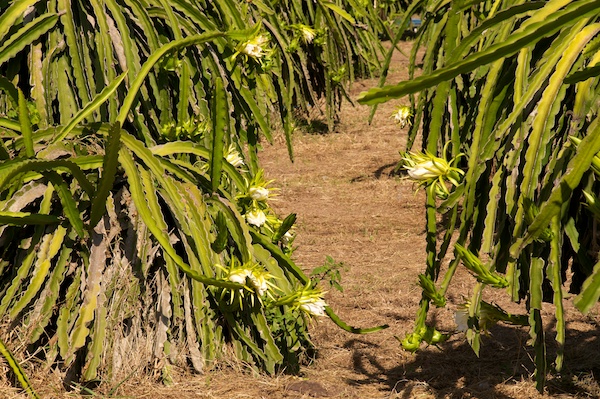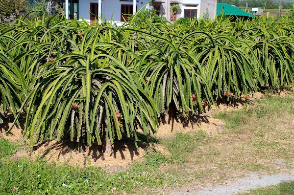 Die typischen Kulturen der Dragon Fruit, Auf Gestellen gezogene Kakteen, welche in langen Reihen angepflanzt werden.