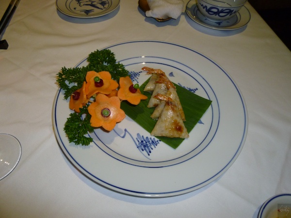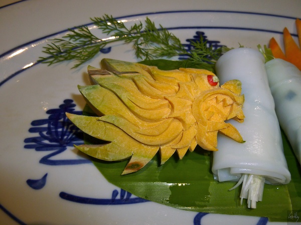 Die „Mandarin Style Spring Rolls“ als nächster Gang waren nicht wie sonst in Asien üblich fritiert, sondern roh. Das Reispapier wurde kurz in Wasser eingelegt und dann mit Crevetten und Gemüse gefüllt. Die ungekochten Rolls schmecken ganz ungewohnt, zumal immer auch etwas frische Minze als Gewürz dabei ist. Die Gemüse sind nicht einfach achtlos auf den Teller geknallt, sondern zu wahren Kunstwerken geschnitzt. Zu schade, dass sie dann wegen Überangebot meinst im Abfall landen. Kein Peterli, sondern etwas Dill zur Dekoration!
