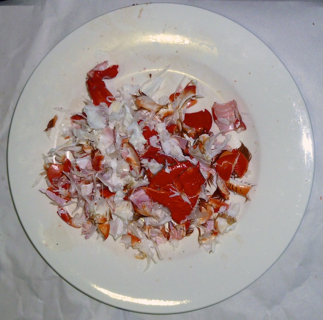 Die Krabbe nach getaner Arbeit, die 30 Minuten brechen, knacken und kratzen liessen nur noch Splitter zurück.