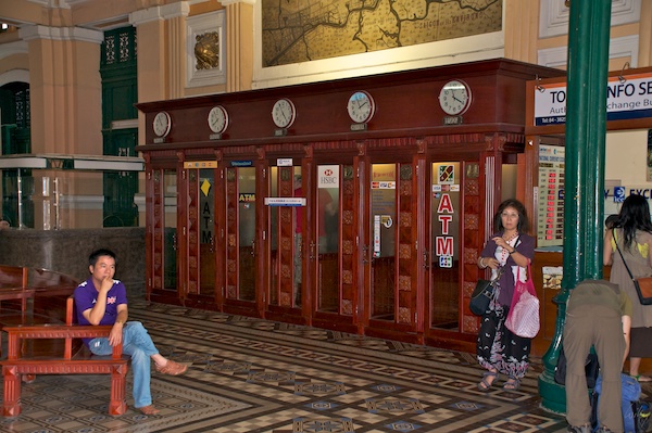 Am Morgen waren wir zu Fuss in der Stadt unterwegs, unter anderem besuchten wir die alte Hauptpost, welche noch von den Franzosen erbaut wurde. Noch heute wird das Gebäude für seinen ursprünglichen Zweck verwendet. Ein Portrait Ho Chi Minhs ziert die Stirnseite der grossen Halle und zeugt von der neuen Zeit.