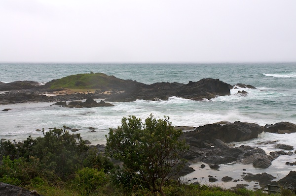 Bereits kurz nach dem Frühstück war es jedoch vorbei mit der Sonne. Auf dem Weg über Coffs Harbour in Richtung Brisbane wollten wir noch in Byron Bay Halt machen, was dann aber buchstäblich ins Wasser fiel. Landregen war heute das Motiv vom späteren Vormittag bis weit in den Abend hinein. Die Landschaft bietet in diesem Wetter nicht gerade viel. Die an sich schöne Felsformation im gold-gelben Sand wirkt so einfach abweisend. Ausser einigen unerschrockenen Surfern war heute auch niemand im Wasser.