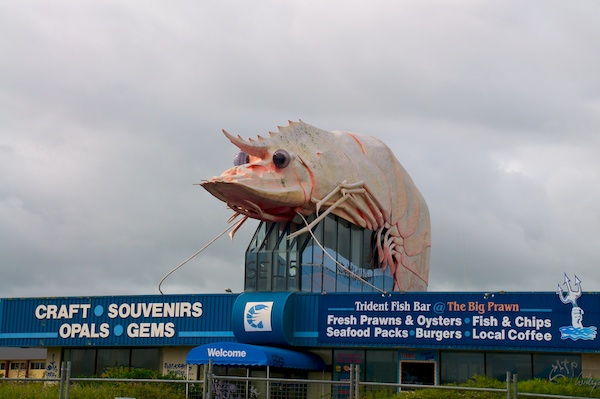 In Ballina steht ein Souvenir-Geschäft, welches die Touristen ebenfalls mit späterem Abfall versorgt. Selbstverständlich dient auch hier ein über-lebensgrosses Tier als Köder und soll die Käufer ins Geschäft locken. Diesmal ein „Big Prawn“, oder eben eine Riesen-Crevette. Daneben werden auch noch orts-typische Meeresfrüchte wie Austern, Crevetten, Fisch&Chips sowie Burger angeboten.