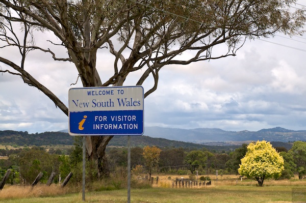 Der Blick zurück zeigt das Schild, mit welchem New South Wales die Besucher willkommen heisst. Dieses ist nur der Vollständigkeit halber hier, da wir ein solches beim Flughafen von Sydney nicht antrafen. Ich wollte sämtliche besuchten Staaten dokumentieren.