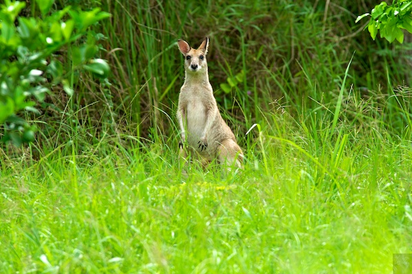 Nach 12 Tagen Australien und gut 3‘000 km auf der Strasse sind wir heute definitiv im Land angekommen. Da wir ein Stück des Weges auf einer ungeteerten Strasse fuhren, waren wir sehr langsam unterwegs und hatten so mehr Zeit, uns um die Natur zu kümmern. So sahen wir dann auch unserer erstes Känguru oder Wallaby, genaues kann ich nicht sagen, da mir der Unterschied nicht klar ist. Kaum waren wir in der Nähe, zog sich das Tier in eine sichere Distanz zurück, dank der langen Linse gelang mir doch noch ein aussagekräftiges Bild.