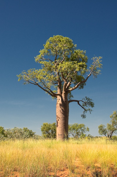 Diese Variante der Baobabs heisst in Australien Boab, botanisch Adansonia gregori. Teilweise sind sie sehr grün, voll im Laub. Je nach Regen in den letzten Wochen sind sie voll belaubt, andere haben das Laub bereits verloren.