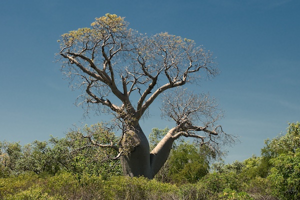 Noch ein grosser Boab, der kaum mehr Blätter zeigt. Der dicke Stamm und der Ast rechts sind Baobab-typisch verdickt. Die übrige Vegetation ist ebenfalls schön grün, dies trotz der bislang ausgebliebenen starken Regen.